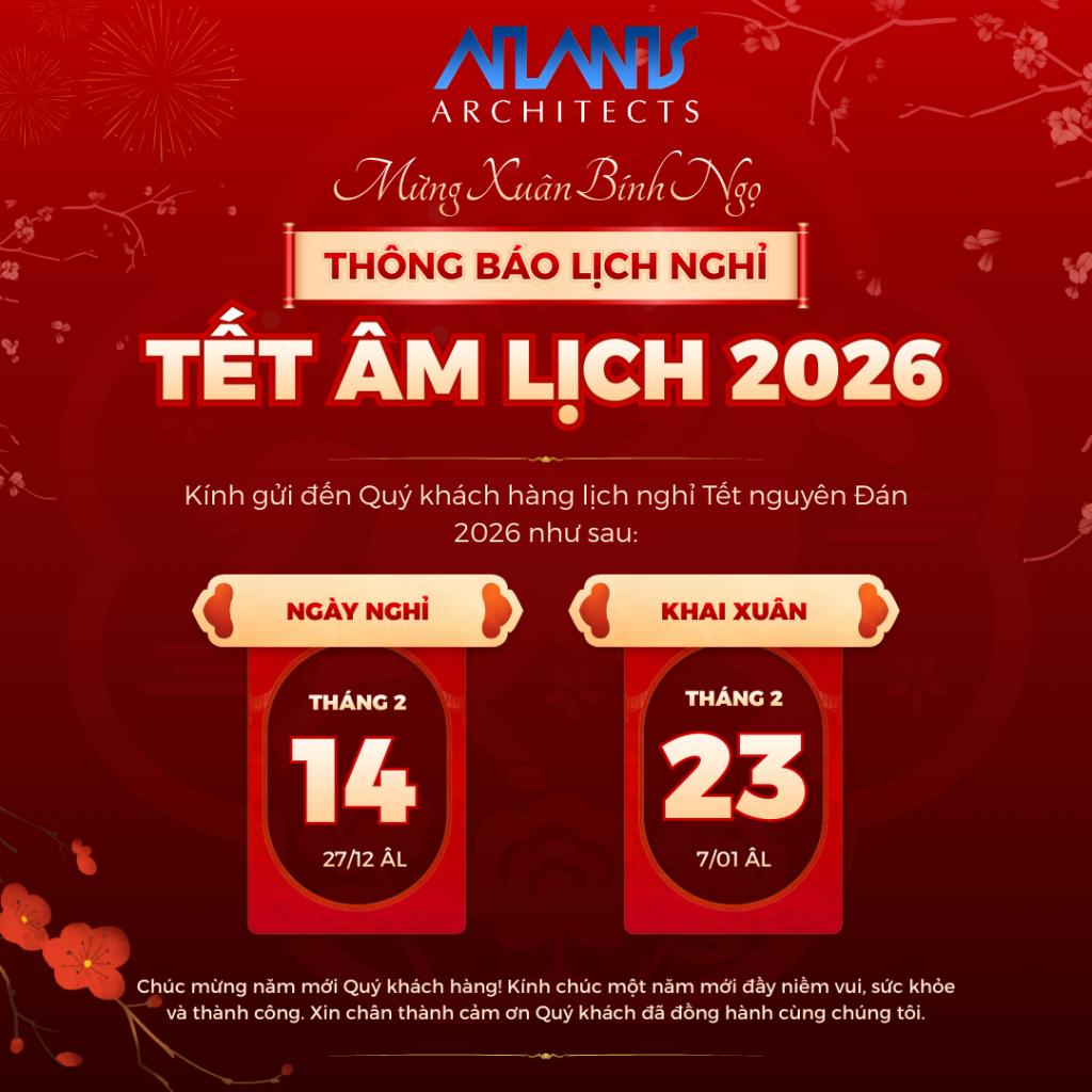 ATLANTIS ARCHITECTS xin trân trọng thông báo đến Quý Khách hàng và Đối tác lịch nghỉ Tết Nguyên Đán như sau: